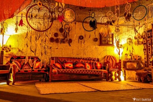 Après quelques explications sur le calendrier solaire andin situé au milieu du temple et sur la ligne équatoriale, la visite se poursuit par une petite séance de relaxation dans une salle aux lumières tamisées où fleurissent les attrape-rêves. Quelques huiles essentielles essayées plus tard, le corps est apaisé et prêt à découvrir les autres pièces de ce temple.